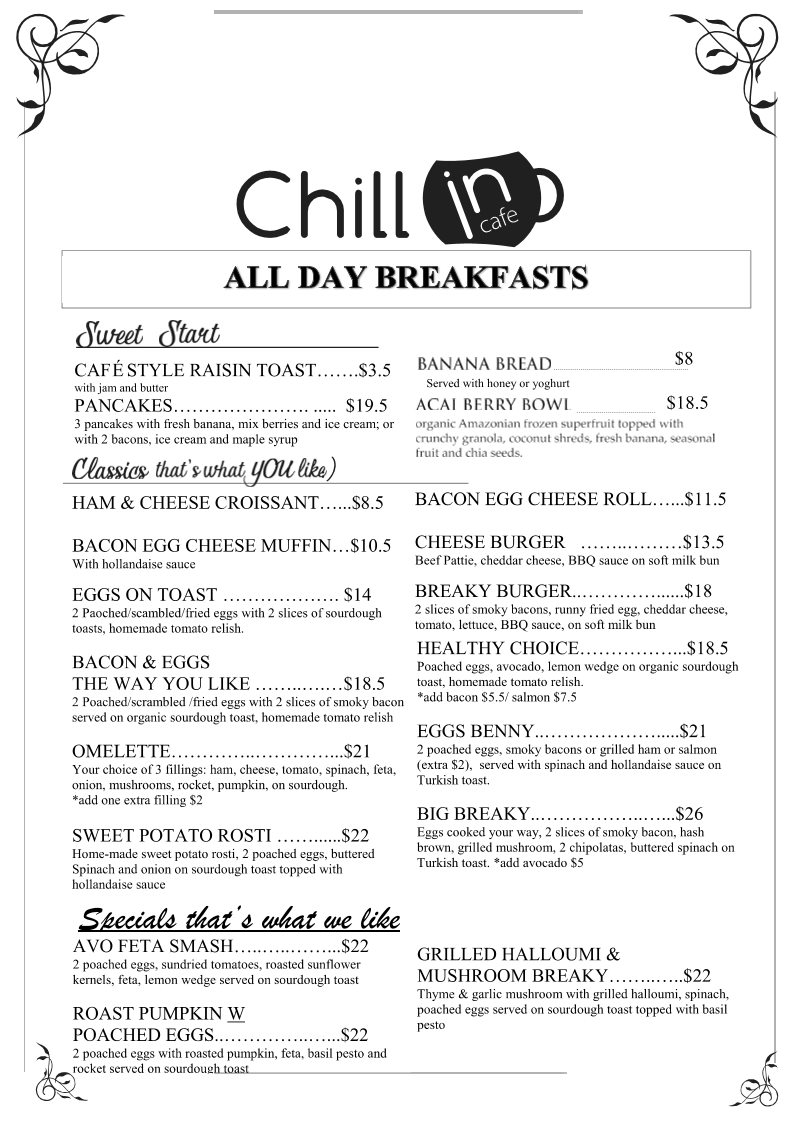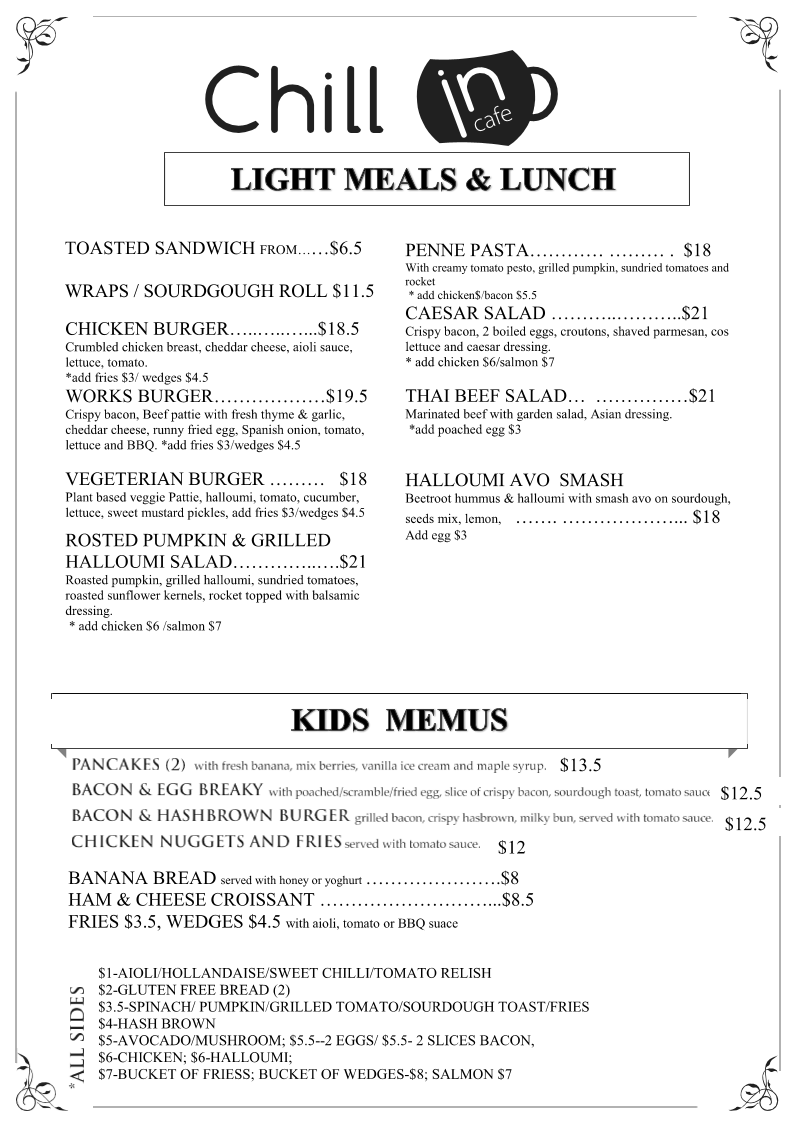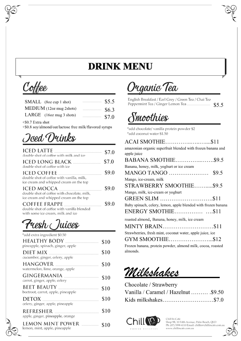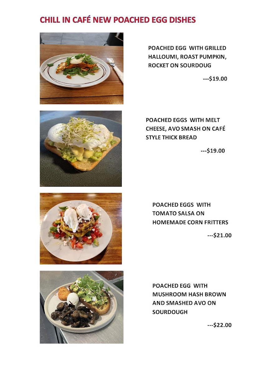 Chill In Cafe at Shop 9b/10 Fifth Ave, Palm Beach offers a menu that balances vibrant health options with classic comfort fare. For refreshing beverages, the cafe serves Smoothies like the Acai Smoothie, Banana Smoothie, Mango Tango, Strawberry Smoothie, and Green Slim, alongside Fresh Juices such as Healthy Body, Diet Mix, Hangover, Gingermania, and Beet Beauty. The Milkshakes section keeps it simple with a classic Vanilla. Light meals and lunch choices include Toasted Sandwiches, Wraps/Sourdough Roll, Chicken Burger, Works Burger, and Vegetarian Burger, offering something for every appetite. Kids are not forgotten, with Pancakes, Bacon & Egg Breaky, Bacon & Hashbrown Burger, Chicken Nuggets and Fries, and Banana Bread. Sweet starters like Café Style Raisin Toast, Pancakes, Banana Bread, and the Acai Berry Bowl cater to those craving a lighter or indulgent touch. Classic favorites under "That’s What You Like" include Ham & Cheese Croissant, Bacon Egg Cheese Roll, Bacon Egg Cheese Muffin, Cheese Burger, and Eggs On Toast, while the specials highlight unique brunch options like Roast Pumpkin with Poached Eggs and Grilled Halloumi & Mushroom Breaky. Completing the experience are chilled beverages such as Iced Latte, Iced Long Black, Iced Coffee, Iced Mocca, and Coffee Frappe. Overall, the menu at Chill In Cafe impresses with its mix of wholesome, sweet, and hearty choices, providing something for every taste and occasion.
